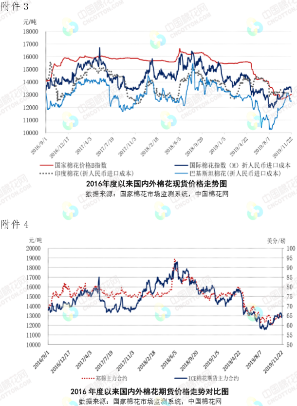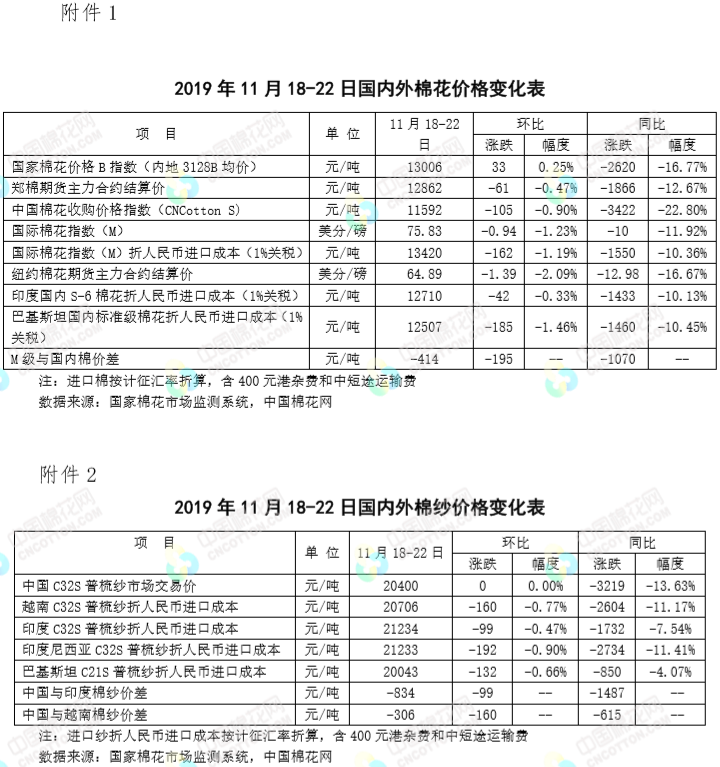本周,中美貿(mào)易關(guān)系不確定性上升,鄭棉振蕩下行;受新疆棉輪入時間臨近提振,皮棉現(xiàn)貨價格保持堅挺。2019年11月18-22日代表內(nèi)地標(biāo)準(zhǔn)級皮棉銷售價格的國家棉花價格B指數(shù)均價13600元/噸,較上周上漲33元/噸,漲幅0.25%;鄭州棉花期貨主力合約結(jié)算均價12862元/噸,較上周下跌61元/噸,跌幅0.47%;代表全國主產(chǎn)棉省(區(qū))白棉3級籽棉折皮棉均價的中國棉花收購價格S指數(shù)11592元/噸,較上周下跌105元/噸,跌幅0.9%。