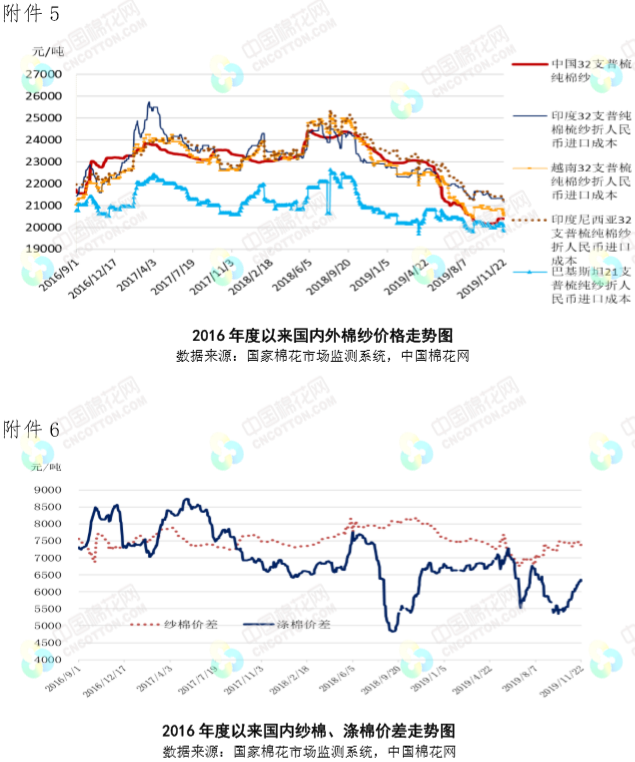 國內(nèi)棉花市場需求不足。據(jù)財政部介紹,今年全年中國的減稅降費(fèi)規(guī)模將達(dá)到2.3萬億,進(jìn)一步加大減稅降費(fèi)力度,減輕制造業(yè)負(fù)擔(dān),改善中國營商環(huán)境,下周國家統(tǒng)計局將公布我國10月規(guī)模以上工業(yè)企業(yè)利潤率,上個月該數(shù)據(jù)錄得近3年最差表現(xiàn),下周需要關(guān)注工業(yè)企業(yè)尤其是10月紡織工業(yè)利潤是否得到改善。國內(nèi)棉花市場方面,據(jù)國家棉花市場監(jiān)測系統(tǒng)數(shù)據(jù)顯示,2019/20年度全國棉花產(chǎn)量預(yù)計584.3萬噸,同比下降4.29%,處近5年均值水平。截至11月22日全國新棉采摘完成98%,累計交售籽棉折皮棉539.2萬噸,累計加工皮棉327.2萬噸,銷售皮棉92.5萬噸,短期季節(jié)性供應(yīng)逐漸增加。由于市場采購放緩,軋花廠庫存增加,鄭棉倉單量快速上升,截至11月22日鄭棉倉單較上周增加7.9萬噸至59.3萬噸。下游紡企原料采購謹(jǐn)慎,棉紗產(chǎn)品銷勢分化,價格競爭激烈,純滌紗銷售仍有一定優(yōu)勢??棌S完成前期訂單后,棉布庫存較大,市場詢價打樣居多,實(shí)單較少,剛需走貨明顯。終端服裝內(nèi)外需市場下滑,前3季度全國50家重點(diǎn)大型零售企業(yè)服裝類零售額同比下降4.0%,降幅相比去年同期擴(kuò)大6.7個百分點(diǎn);10月我國紡織品服裝出口額同比下降1.67%。由于中美貿(mào)易磋商前景不明,市場謹(jǐn)慎避險情緒為主,預(yù)計年前需求難以好轉(zhuǎn),棉價走勢缺乏動力。