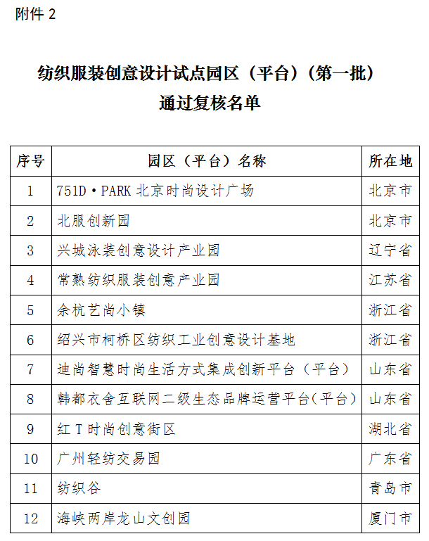 附件:紡織服裝創(chuàng)意設(shè)計(jì)試點(diǎn)園區(qū)(平臺(tái))(第一批)通過復(fù)核名單