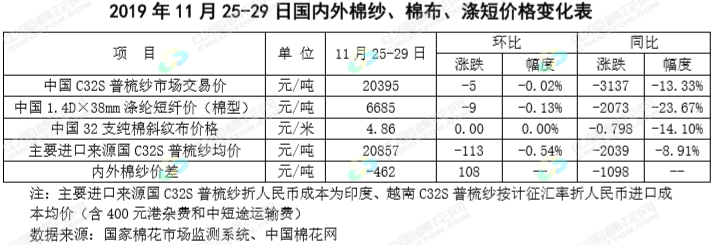 本周,市場靜待儲備棉輪入,內(nèi)外棉價差縮小。2019年11月25-29日,國內(nèi)市場棉花現(xiàn)貨價格指數(shù)均價13058元/噸(中國棉花價格指數(shù)(312B品種)和國家棉花價格指數(shù)(3128B)算術(shù)平均值),較上周上漲11元/噸,漲幅0.08%,國際市場棉花現(xiàn)貨價格指數(shù)(考特魯克A指數(shù))均價74.81美分/磅,較上周上漲0.5美分/磅,漲幅0.68%,折人民幣進口成本12846元/噸,較上周上漲86元/噸,漲幅0.68%;內(nèi)外棉價差208元/噸,價差較上周縮小80元/噸。