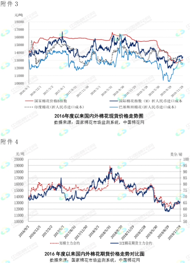 本周,中美經(jīng)貿(mào)磋商預(yù)期從樂觀轉(zhuǎn)為疑慮,國際棉價先揚后抑,整體較上周有所上漲。2019年11月25-29日紐約棉花期貨主力合約結(jié)算價65.73美分/磅,較上周上漲0.84美分/磅,漲幅1.29%,代表進口棉中國主港到岸均價的國際棉花指數(shù)(M)75.67美分/磅,較上周上漲0.84美分/磅,漲幅1.29%,折人民幣進口成本13393元/噸(含港雜及運輸費),較上周上漲177元/噸,漲幅1.34%;國際棉花指數(shù)(M)折人民幣進口成本高于國家棉花價格B指數(shù)357元/噸,價差較上周縮小157元/噸。