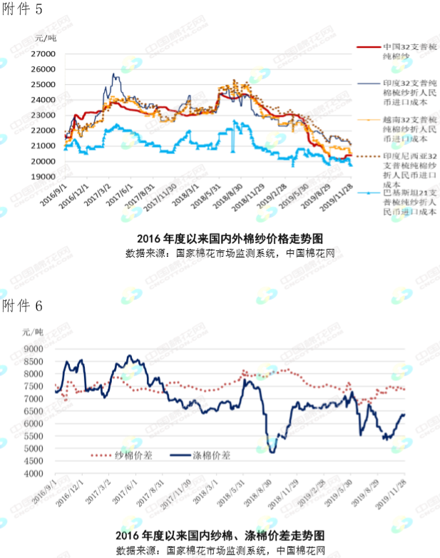 國際棉價上漲空間受限,不確定性仍將持續(xù)。近期美國假日購物消費者轉(zhuǎn)向網(wǎng)購的趨勢延續(xù),實體零售業(yè)反而面臨更嚴峻的形勢,美國11月消費者信心連續(xù)第4個月下滑,國際貿(mào)易關(guān)系持續(xù)緊張削弱美國和全球經(jīng)濟增長,多方數(shù)據(jù)印證制造業(yè)可能存在潛在疲弱。國際棉花市場方面,北半球棉花收獲加快,供應(yīng)量增加,據(jù)美國農(nóng)業(yè)部數(shù)據(jù)顯示,截至11月24日美棉收獲進度78%,比去年同期增加10個百分點。截至11月21日美國陸地棉檢驗量225.9萬噸,同比增加29.3%。據(jù)印度棉花公司(CCI)統(tǒng)計,截至11月18日2019/20年度籽棉采收數(shù)量折皮棉約49萬噸,較上年10月增長約28%。11月中旬以來印度最低收購(MSP)已全面展開,不過印度棉花公司(CCI)收購對籽棉回潮率、品質(zhì)等指標要求較嚴格,使MSP收購對市場支持力度并不明顯。國際棉紗市場交投清淡,價格小幅下跌為主,中美貿(mào)易摩擦使印度對中國紗線出口減半,中巴簽訂自貿(mào)協(xié)定讓印度棉紗處境更加艱難,越南、印尼、烏茲別克斯坦等棉紗出口也有不同程度下降。目前中美經(jīng)貿(mào)磋商左右棉花消費前景,在中美經(jīng)貿(mào)磋商未明朗前,棉花需求短期難以改善,國際棉價上漲空間受限,不確定性仍將持續(xù)。