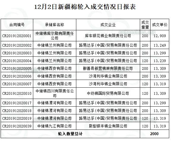 12月2日,中國儲備棉管理有限公司計劃采購新疆棉7000噸,實際成交2000噸,成交率28.57%,成交均價13259元/噸,成交最高價13319元/噸,成交最低價12909元/噸。其中新疆庫成交200噸、內(nèi)地庫成交1800噸。