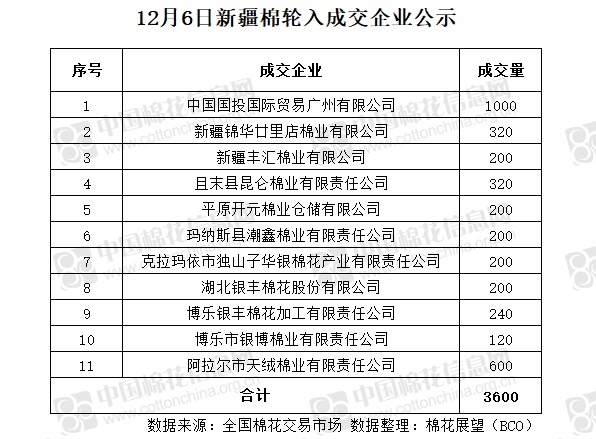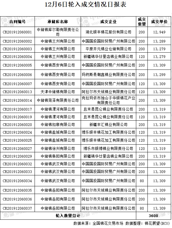 12月6日,中國儲(chǔ)備棉管理有限公司計(jì)劃采購新疆棉7000噸,實(shí)際成交3600噸,成交率51.43%,成交均價(jià)13288元/噸,較5日漲103元/噸,成交最高價(jià)13319元/噸,較5日持平,成交最低價(jià)12949元/噸,較5日漲50元/噸。其中新疆庫成交200噸、內(nèi)地庫成交3400噸。