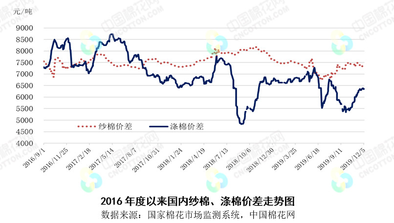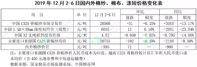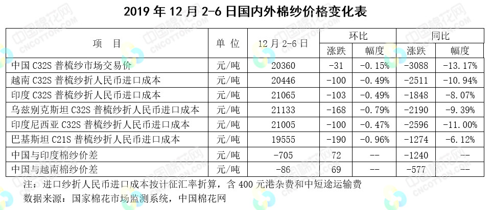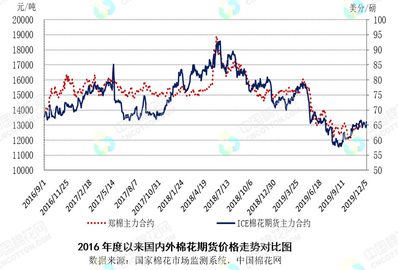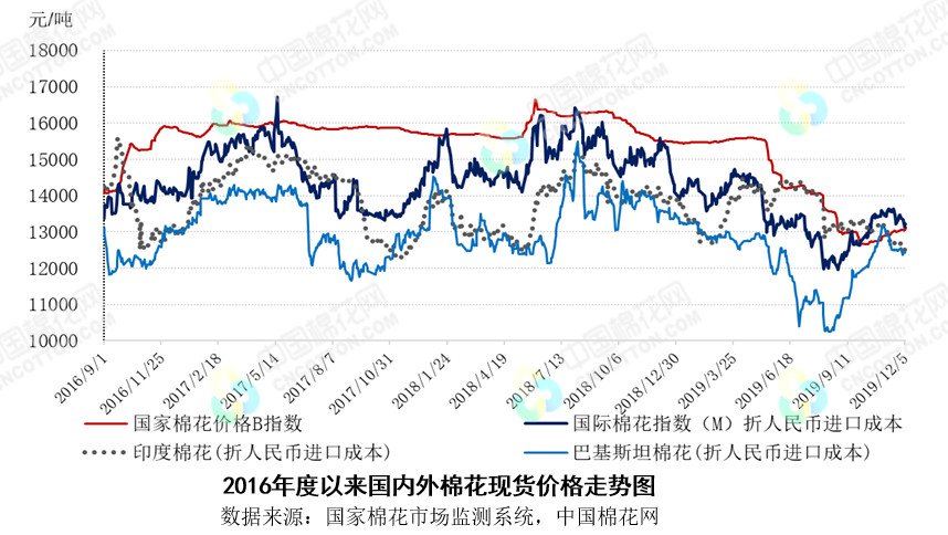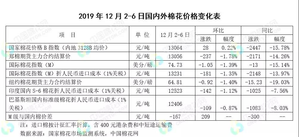 本周,市場(chǎng)先后受中美貿(mào)易消息、美棉簽約下降及美國(guó)就業(yè)數(shù)據(jù)好于預(yù)期影響,國(guó)際棉價(jià)先跌后漲,整體較上周下跌。2019年12月2-6日紐約棉花期貨主力合約結(jié)算價(jià)64.81美分/磅,較上周下跌0.92美分/磅,跌幅1.40%,代表進(jìn)口棉中國(guó)主港到岸均價(jià)的國(guó)際棉花指數(shù)(M)74.73美分/磅,較上周下跌1.05美分/磅,跌幅1.39%,折人民幣進(jìn)口成本13231元/噸(含港雜及運(yùn)輸費(fèi)),較上周下跌181元/噸,跌幅1.35%;國(guó)際棉花指數(shù)(M)折人民幣進(jìn)口成本高于國(guó)家棉花價(jià)格B指數(shù)167元/噸,價(jià)差較上周縮小209元/噸。
