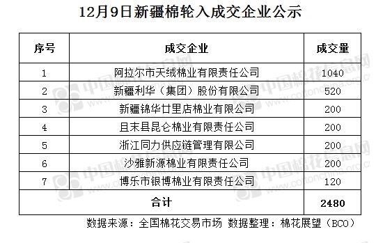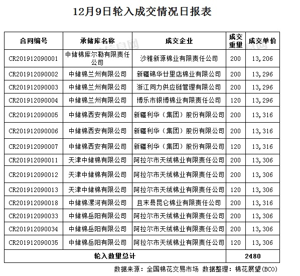 12月9日,中國儲備棉管理有限公司計劃采購新疆棉7000噸,實際成交2480噸,成交率35.43%,成交均價13299元/噸,較6日漲11元/噸,成交最高價13316元/噸,較6日跌3元/噸,成交最低價13206元/噸,較6日漲257元/噸。 其中新疆庫成交200噸,內(nèi)地庫成交2280噸。