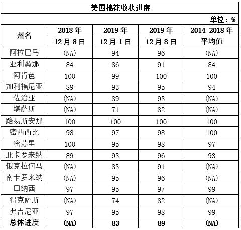 12月9日美國(guó)農(nóng)業(yè)部發(fā)布的美國(guó)棉花生產(chǎn)報(bào)告顯示,截至2019年12月8日美棉收獲進(jìn)度89%,較前周增加6個(gè)百分點(diǎn),除堪薩斯州和得克薩斯州以外,其他地區(qū)收獲已基本結(jié)束。