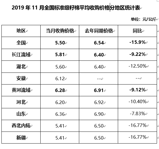 據(jù)統(tǒng)計(jì),截止到11月30日,全國(guó)400型棉花加工企業(yè)3128級(jí)籽棉平均收購(gòu)價(jià)5.50元/公斤,同比下降15.90%。新疆籽棉收購(gòu)價(jià)5.41元/公斤,同比下降16.77%;長(zhǎng)江流域籽棉收購(gòu)價(jià)5.81元/公斤,同比下降9.22%;黃河流域收購(gòu)價(jià)6.28元/公斤,同比下降9.12%。