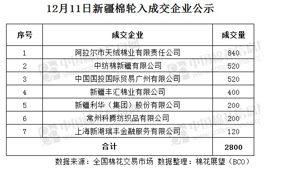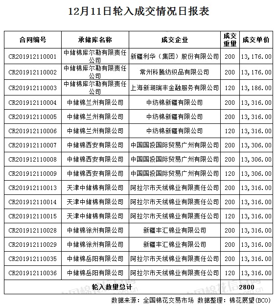 12月11日,中國儲備棉管理有限公司計(jì)劃采購新疆棉7000噸,實(shí)際成交2800噸,成交率40%,成交均價(jià)13289元/噸,較10日跌2元/噸,成交最高價(jià)13316元/噸,較10日持平,成交最低價(jià)13176元/噸,較10日漲10元/噸。其中新疆庫成交520噸,內(nèi)地庫成交2280噸。