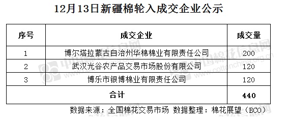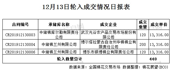 12月13日,中國儲備棉管理有限公司計劃采購新疆棉7000噸,實際成交440噸,成交率6.29%,成交均價13316元/噸,較12日漲24元/噸,成交最高價13316元/噸,較12日持平,成交最低價13316元/噸,較12日漲80元/噸。其中新疆庫成交120噸,內地庫成交320噸。