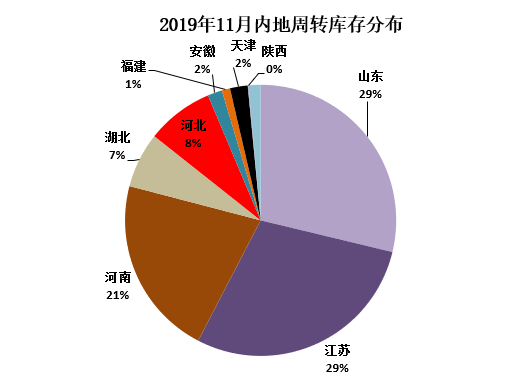 分省份看,江蘇省庫存量居首位為13.17萬噸,江蘇省次之為13.12萬噸,河南省居第三位為9.78萬噸,河北省為3.65萬噸,湖北省為3.01萬噸,其他省在萬噸以下。