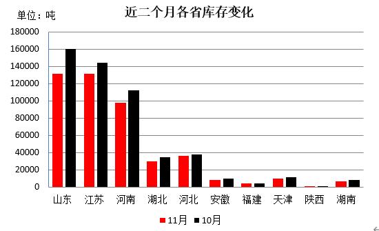 從庫存量變化情況看,各省份均有不同程度下降。其中降幅最大的是山東省,較上月減少2.89萬噸;其次河南減少1.49萬噸;江蘇減少1.25萬噸;湖北省減少0.47萬噸;安徽省減少0.23萬噸;其他省份降幅在0.2萬噸以下。