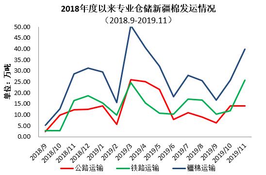 2019年1-11月出疆棉公路與鐵路共發(fā)運(yùn)322.34萬噸,同比增加39.98萬噸。