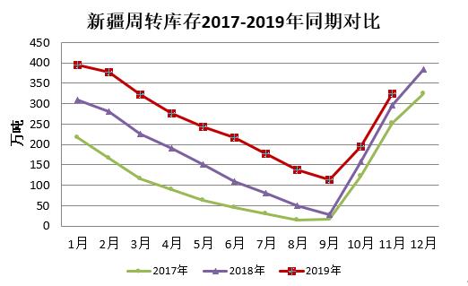 截至11月底新疆43家倉庫商品棉周轉(zhuǎn)庫存324.52萬噸,環(huán)比增加129.87萬噸,高于去年同期27.72萬噸。