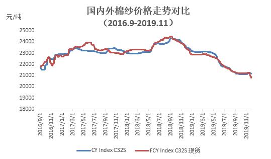 本月國內(nèi)棉紗價格略有上漲,而進(jìn)口棉紗價格繼續(xù)下跌。據(jù)調(diào)查,國產(chǎn)32支純棉紗11月均價21185元/噸,較上月上升73元/噸,漲幅0.35%,較去年同期下跌2583元/噸,跌幅10.87%;進(jìn)口32支純棉紗月均價21171元/噸,較上月下跌21元/噸,跌幅0.1%,較去年同期下跌2516元/噸,跌幅10.6%。