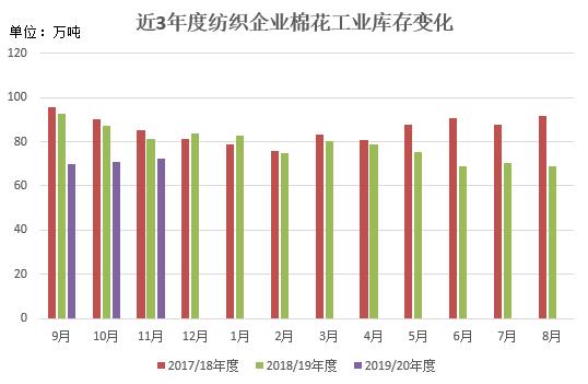 11月受中美貿(mào)易磋商進(jìn)展影響,紡織市場上半月延續(xù)10月回暖趨勢,棉花采購力度加大,但下半月行情轉(zhuǎn)淡,市場恢復(fù)疲軟狀態(tài)。據(jù)中國棉花預(yù)警系統(tǒng)對全國90余家定點(diǎn)紡織企業(yè)調(diào)查顯示,紡織企業(yè)原料庫存上升,紡織品產(chǎn)量環(huán)比略增,紗線庫存穩(wěn)中略增,布庫存上升。