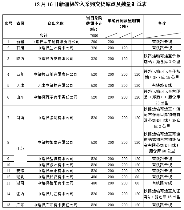 中國儲備棉管理有限公司定于2019年12月16日采購新疆棉7000噸(公定重量),最高限價13425元/噸(折標準級3128B價格)。具體庫點及數(shù)量如下: