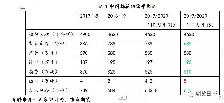 按照被調(diào)查棉農(nóng)植棉面積加權(quán)平均計(jì)算,預(yù)計(jì)全國(guó)棉花總產(chǎn)量590.57萬(wàn)噸,同比下降3.35%,與上期持平;分區(qū)域看,新疆產(chǎn)量503.95萬(wàn)噸,同比下降1.9%;長(zhǎng)江流域產(chǎn)量36.05萬(wàn)噸,同比下降11.34%;黃河流域預(yù)測(cè)產(chǎn)量46.7萬(wàn)噸,同比下降9.84%。通過(guò)2018年12月至2019年9月工商業(yè)庫(kù)存變化及2019年1-9月進(jìn)口量和儲(chǔ)備棉輪出量,大致推算得到2019年1-9月國(guó)內(nèi)累計(jì)消費(fèi)棉花543.06萬(wàn)噸,月均消費(fèi)60.34萬(wàn)噸,由此推算出全年消費(fèi)724.08萬(wàn)噸,由于進(jìn)入10月后,下游紡織消費(fèi)較差,預(yù)計(jì)全年消費(fèi)大致700萬(wàn)噸左右,可能并不如國(guó)家統(tǒng)計(jì)局預(yù)計(jì)810萬(wàn)噸這樣樂(lè)觀。