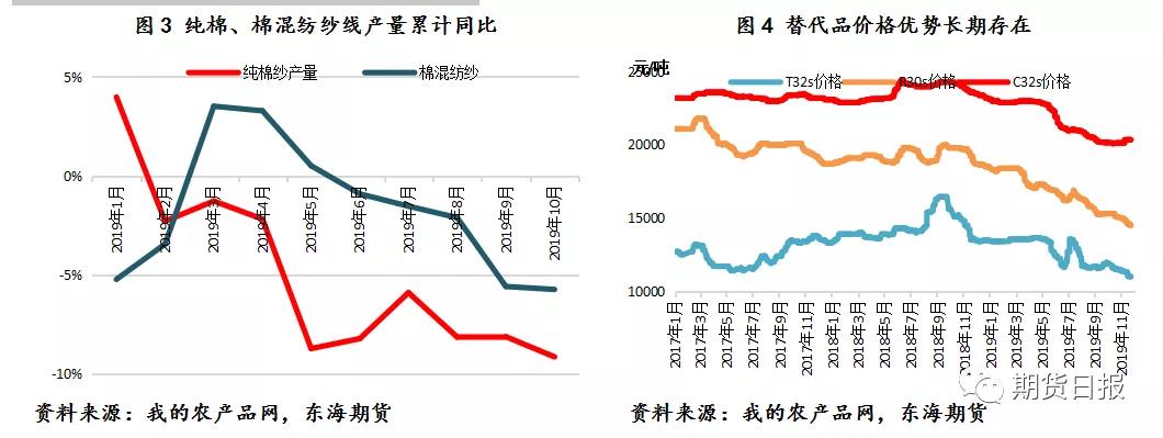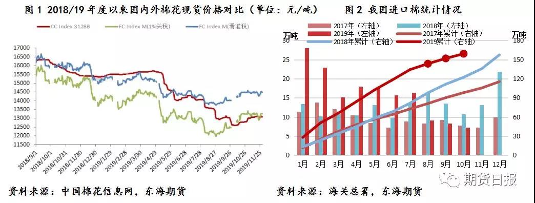 受貿(mào)易戰(zhàn)、宏觀環(huán)境及人民幣貶值等因素影響,國(guó)內(nèi)現(xiàn)貨市場(chǎng)整體較為清淡,國(guó)際棉市強(qiáng)于國(guó)內(nèi),內(nèi)外棉現(xiàn)貨價(jià)再次倒掛,12月初國(guó)內(nèi)低于國(guó)際1%關(guān)稅價(jià)150-200元/噸,外棉通關(guān)已無(wú)競(jìng)爭(zhēng)優(yōu)勢(shì),后期大概率優(yōu)先消耗國(guó)內(nèi)資源,利好皮棉現(xiàn)貨。今年以來(lái)國(guó)內(nèi)外棉價(jià)價(jià)差縮窄,且維持時(shí)間較長(zhǎng),做擴(kuò)內(nèi)外棉價(jià)差策略失靈,預(yù)計(jì)在國(guó)內(nèi)供應(yīng)充足、成本中心下移的背景下,國(guó)內(nèi)棉花將逐步與國(guó)際棉花接軌,競(jìng)爭(zhēng)力逐步顯現(xiàn),內(nèi)外棉價(jià)差縮窄將是一個(gè)長(zhǎng)期狀態(tài),這也是國(guó)內(nèi)棉花參與國(guó)際市場(chǎng)的第一步。
