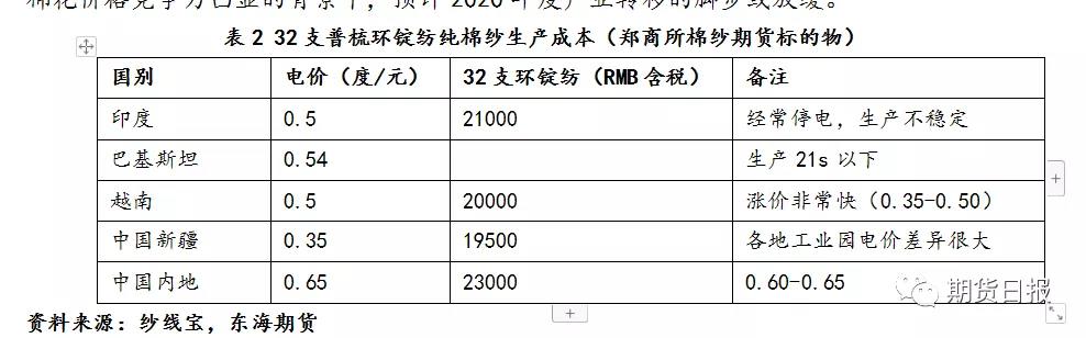 棉紗生產(chǎn)也值得關(guān)注,棉紗生產(chǎn)是否具有競(jìng)爭(zhēng)力,目前主要聚焦于上游原料價(jià)格和電費(fèi),在我國(guó)棉價(jià)逐步具有競(jìng)爭(zhēng)力的背景下,聚焦電費(fèi),我們可以看到中國(guó)新疆電費(fèi)優(yōu)勢(shì)是巨大的,因此預(yù)計(jì)在未來(lái),新疆棉紗也將逐步占有更大市場(chǎng),國(guó)內(nèi)棉紗優(yōu)勢(shì)將逐步體現(xiàn)。同時(shí)我們也關(guān)注到,在中美貿(mào)易爭(zhēng)端背景下,有部分下游企業(yè)向東南亞轉(zhuǎn)移。在國(guó)內(nèi)棉價(jià)競(jìng)爭(zhēng)力凸顯背景下,預(yù)計(jì)2020年度產(chǎn)業(yè)轉(zhuǎn)移腳步或放緩。