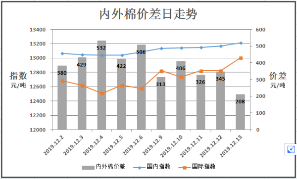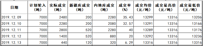 上周(2019年12月9-13日)是2019年度新疆棉輪入第二周,中國儲備棉管理有限公司計劃采購新疆棉3.5萬噸,實際成交9400噸,最高限價13316元/噸,輪入成交均價13297元/噸,較前周上漲75元/噸。內(nèi)外棉價差208-406元/噸,未達到800元/噸警戒線。