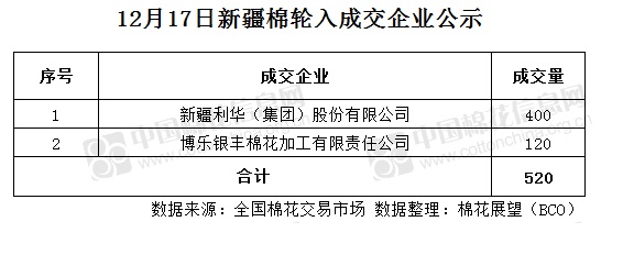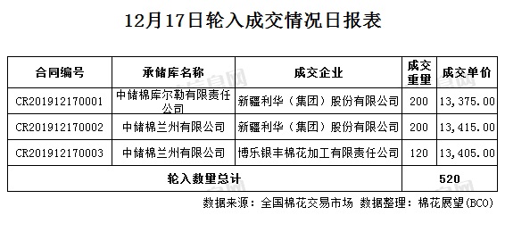 12月17日,中國(guó)儲(chǔ)備棉管理有限公司計(jì)劃采購(gòu)新疆棉7000噸,實(shí)際成交520噸,成交率7.43%,成交均價(jià)13397元/噸,較16日跌18元/噸,成交最高價(jià)13415元/噸,較16日跌10元/噸,成交最低價(jià)13375元/噸,較16日漲10元/噸。其中新疆庫(kù)成交200噸,內(nèi)地庫(kù)成交320噸。