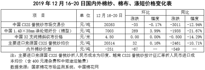 本周,國內紡織市場氣氛雖有所好轉,但成交依然謹慎,純棉紗價格陰跌為主;國際棉紗銷售小幅增加,外紗價格略有上漲;常規(guī)外紗價格高于國產紗203元/噸;下游織廠規(guī)劃提前放假,純棉布價格平穩(wěn)為主;滌綸短纖價格隨石油走勢回升。