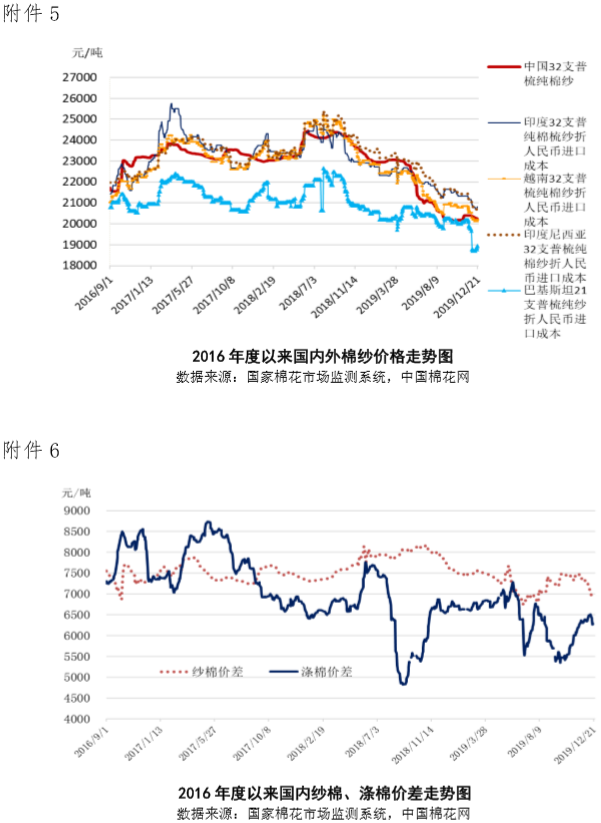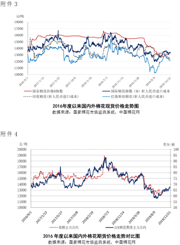 本周,儲備棉輪入價格跟隨鄭棉價格上漲,內外棉價差繼續(xù)縮小。2019年12月16-20日儲備棉輪入成交均價13407元/噸,較上周上漲113元/噸,漲幅0.85%,國內市場棉花現(xiàn)貨價格指數(shù)均價13238元/噸(中國棉花價格指數(shù)(312B品種)和國家棉花價格指數(shù)(3128B)算術平均值),較上周上漲76元/噸,漲幅0.58%,國際市場棉花現(xiàn)貨價格指數(shù)(考特魯克A指數(shù))均價76.08美分/磅,較上周上漲0.62美分/磅,漲幅0.82%,折人民幣進口成本12947元/噸,較上周上漲106元/噸,漲幅0.82%;內外棉價差290元/噸,價差較上周縮小30元/噸。