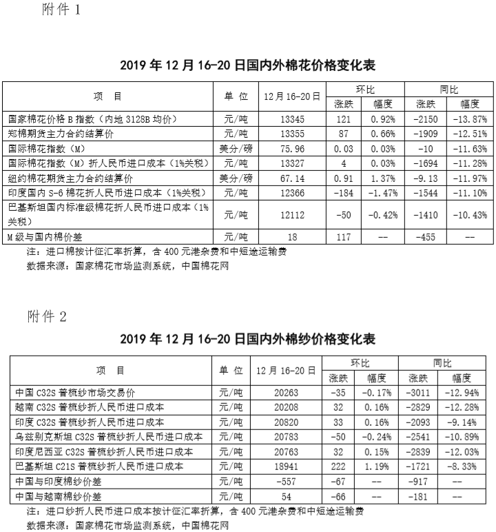 本周,市場仍在消化中美達成第一階段經貿協(xié)議消息,推動國內棉價繼續(xù)小幅上漲。2019年12月16-20日代表內地標準級皮棉銷售價格的國家棉花價格B指數(shù)均價13345元/噸,較上周上漲121元/噸,漲幅0.92%;鄭州棉花期貨主力合約結算均價13355元/噸,較上周上漲87元/噸,漲幅0.66%。