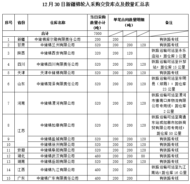 中國儲備棉管理有限公司定于2019年12月30日采購新疆棉7000噸(公定重量),最高限價13578元/噸(折標(biāo)準(zhǔn)級3128B價格)。具體庫點(diǎn)及數(shù)量如下: