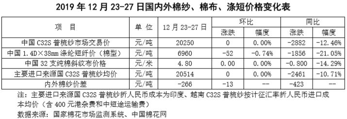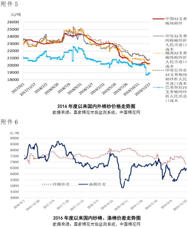 本周,儲(chǔ)備棉輪入價(jià)格跟隨期現(xiàn)貨價(jià)格上漲,內(nèi)外棉價(jià)差繼續(xù)縮小。2019年12月23-27日儲(chǔ)備棉輪入成交均價(jià)13522元/噸,較上周上漲115元/噸,漲幅0.85%,國(guó)內(nèi)市場(chǎng)棉花現(xiàn)貨價(jià)格指數(shù)均價(jià)13302元/噸(中國(guó)棉花價(jià)格指數(shù)(312B品種)和國(guó)家棉花價(jià)格指數(shù)(3128B)算術(shù)平均值),較上周上漲45元/噸,漲幅0.34%,國(guó)際市場(chǎng)棉花現(xiàn)貨價(jià)格指數(shù)(考特魯克A指數(shù))均價(jià)77.48美分/磅,較上周上漲1.4美分/磅,漲幅1.84%,折人民幣進(jìn)口成本13172元/噸,較上周上漲225元/噸,漲幅1.74%;內(nèi)外棉價(jià)差123元/噸,價(jià)差較上周縮小186元/噸。