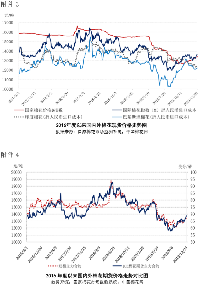 本周,受國(guó)際貿(mào)易樂(lè)觀情緒及美元指數(shù)大跌等因素影響,國(guó)際棉價(jià)繼續(xù)上漲。2019年12月23-27日紐約棉花期貨主力合約結(jié)算價(jià)68.73美分/磅,較上周上漲1.59美分/磅,漲幅2.37%,代表進(jìn)口棉中國(guó)主港到岸均價(jià)的國(guó)際棉花指數(shù)(M)77.47美分/磅,較上周上漲1.51美分/磅,漲幅1.99%,折人民幣進(jìn)口成本13584元/噸(含港雜及運(yùn)輸費(fèi)),較上周上漲257元/噸,漲幅1.93%,國(guó)際棉花指數(shù)(M)折人民幣進(jìn)口成本高于國(guó)家棉花價(jià)格B指數(shù)184元/噸,上周是國(guó)家棉花價(jià)格B指數(shù)高于國(guó)際棉花指數(shù)(M)折人民幣進(jìn)口成本18元/噸。