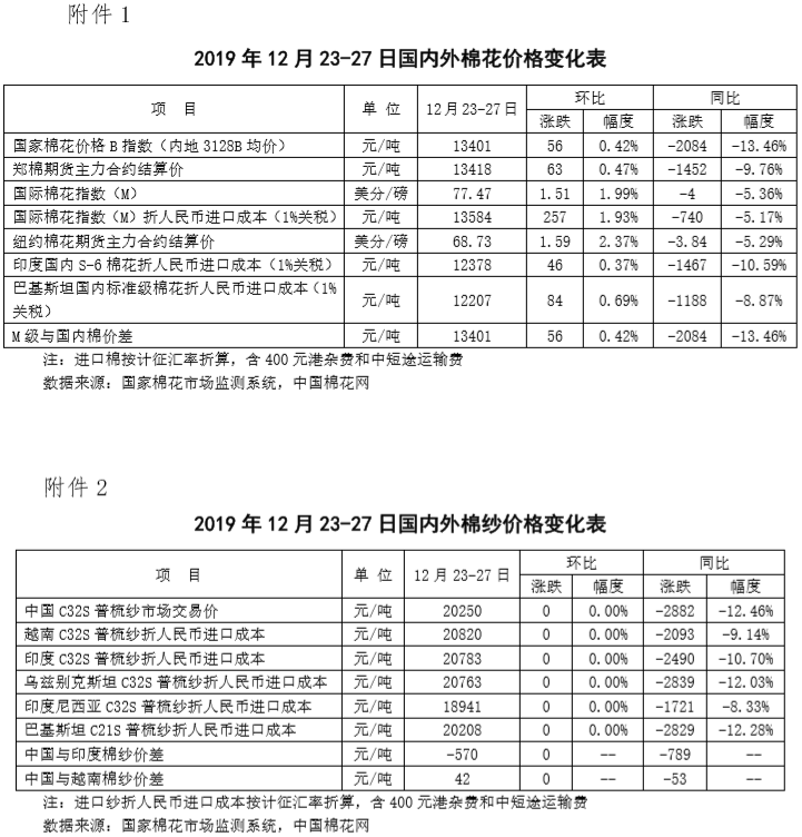 本周,受中美雙方正在履行法律審核、翻譯校對(duì)等必要程序消息及儲(chǔ)備棉持續(xù)輪入提振,國(guó)內(nèi)棉價(jià)繼續(xù)小幅上漲。2019年12月23-27日代表內(nèi)地標(biāo)準(zhǔn)級(jí)皮棉銷售價(jià)格的國(guó)家棉花價(jià)格B指數(shù)均價(jià)13401元/噸,較上周上漲56元/噸,漲幅0.42%;鄭州棉花期貨主力合約結(jié)算均價(jià)13418元/噸,較上周上漲62元/噸,漲幅0.47%。