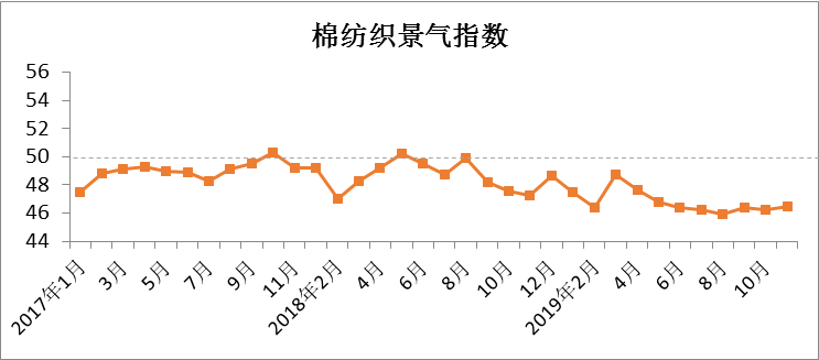 2019年11月中國棉紡織景氣指數(shù)46.45,與10月相比上升0.24。11月初,中美雙方同意隨協(xié)議進展,分階段取消加征關(guān)稅,此消息緩解市場悲觀情緒,下游采購有所增加,但多為小單,棉花價格小幅上漲,紗線價格在連續(xù)7個月下跌后出現(xiàn)回升跡象,坯布價格止跌企穩(wěn)。11月14日儲備棉輪入政策正式公布,棉花紡織產(chǎn)業(yè)鏈上各方均表示符合市場預(yù)期,對市場有積極影響。整體來看,11月,市場信心略有增加。12月初,中美貿(mào)易談判再生變數(shù),市場再現(xiàn)悲觀情緒。雖12月13日,國務(wù)院新聞辦公室召開新聞發(fā)布會,表示中美第一階段經(jīng)貿(mào)協(xié)議文本達成一致,但協(xié)議簽署的時間、地點及形式等還在商定中。因此,市場擔憂情緒并未有效消除。