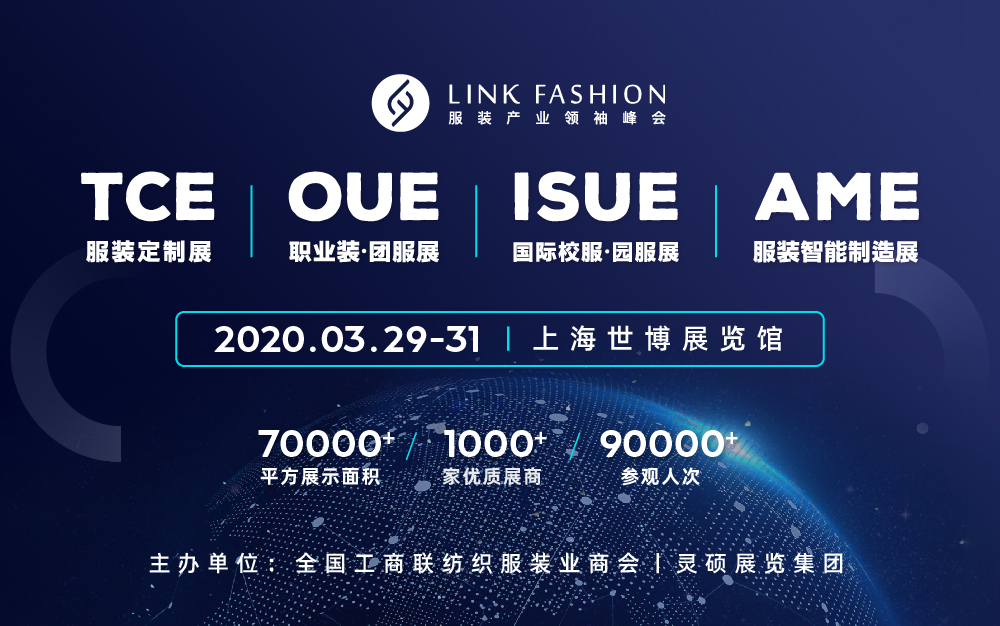 由中華全國工商聯(lián)紡織服裝業(yè)商會與靈碩展覽集團主辦的“2020 全球服裝產(chǎn)業(yè)領(lǐng)袖峰會”融合旗下四大品牌展會TCE 服裝定制展,OUE 職業(yè)裝 · 團服展,ISUE 國際校服 · 園服展,AME 服裝智能制造展,將于 2020 年 3 月 29-31日在上海世博展覽中心舉行, 超過 70000 ㎡展示面積,1000+優(yōu)質(zhì)參展商,90000+ 參觀人次,超 20 場會議活動。 屆時將匯聚國內(nèi)外紡織服裝行業(yè)精英領(lǐng)袖,傾力打造全球服裝產(chǎn)業(yè)頂級盛會。