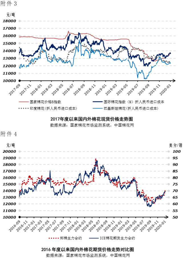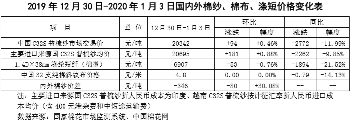 本周,受鄭棉期貨大漲推動,現(xiàn)貨市場看漲情緒濃厚,內(nèi)外棉價差持續(xù)擴大。2019年12月30日-2020年1月3日,中央儲備棉連續(xù)4天無成交記錄,國內(nèi)市場棉花現(xiàn)貨價格指數(shù)均價13598元/噸(中國棉花價格指數(shù)(312B品種)和國家棉花價格指數(shù)(3128B)算術(shù)平均值),較上周上漲286元/噸,漲幅2.15%,國際市場棉花現(xiàn)貨價格指數(shù)(考特魯克A指數(shù))均價78.04美分/磅,較上周上漲0.56美分/磅,漲幅0.72%,折人民幣進口成本13266元/噸,較上周上漲80元/噸,漲幅0.61%;內(nèi)外棉價差332元/噸,價差較上周擴大203元/噸。