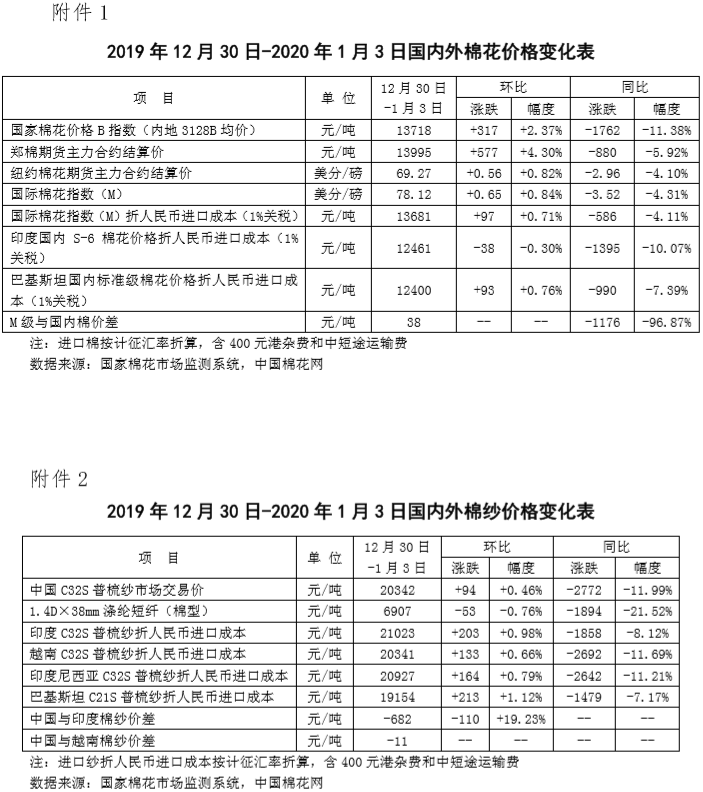 本周,周初中美經(jīng)貿(mào)磋商跟進消息繼續(xù)增強市場預(yù)期,中國央行宣布下調(diào)金融機構(gòu)存款準備金率0.5個百分點,周末國際局勢惡化,棉花市場整體上漲。2019年12月30日-2020年1月3日代表內(nèi)地標準級皮棉銷售價格的國家棉花價格B指數(shù)均價13718元/噸,較上周上漲317元/噸,漲幅2.37%;鄭州棉花期貨主力合約結(jié)算均價13995元/噸,較上周上漲577元/噸,漲幅4.30%。鄭棉期貨先揚后抑,現(xiàn)貨周后期漲幅顯著收斂。1月3日鄭棉主力合約結(jié)算價14035元/噸,比前日下跌35元/噸。12月30及31日、1月2日及3日國棉現(xiàn)貨價格較前一日上漲幅度1.58%、0.21%、0.15%、0.19%。