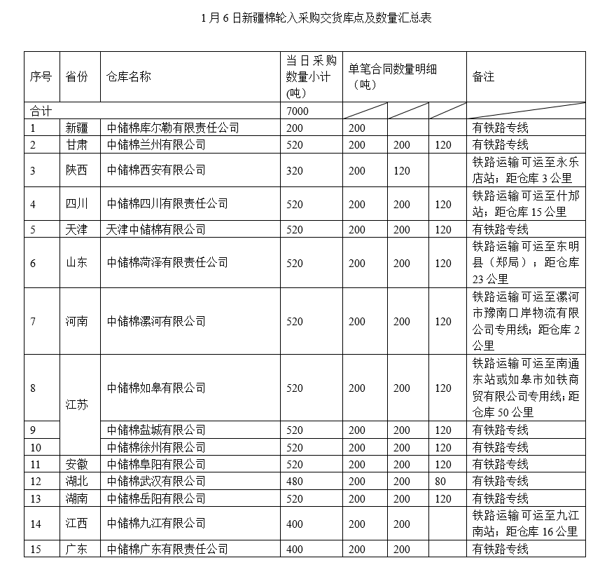 中國(guó)儲(chǔ)備棉管理有限公司定于2020年1月6日采購(gòu)新疆棉7000噸(公定重量),最高限價(jià)13869元/噸(折標(biāo)準(zhǔn)級(jí)3128B價(jià)格)。具體庫(kù)點(diǎn)及數(shù)量如下: