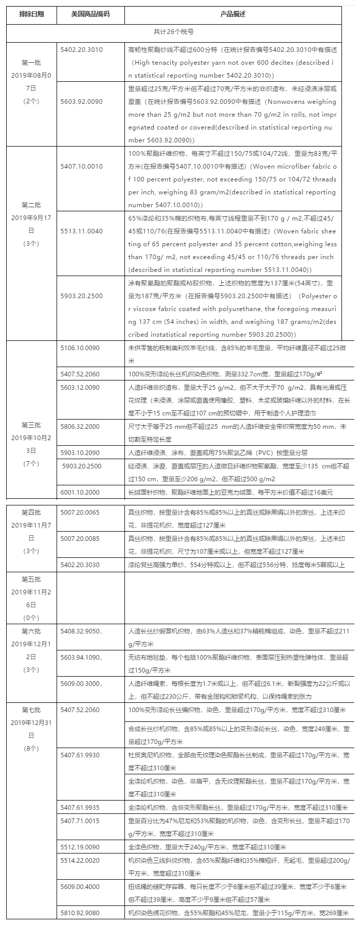 2000億美元征稅產(chǎn)品排除清單中紡織服裝產(chǎn)品排除匯總表