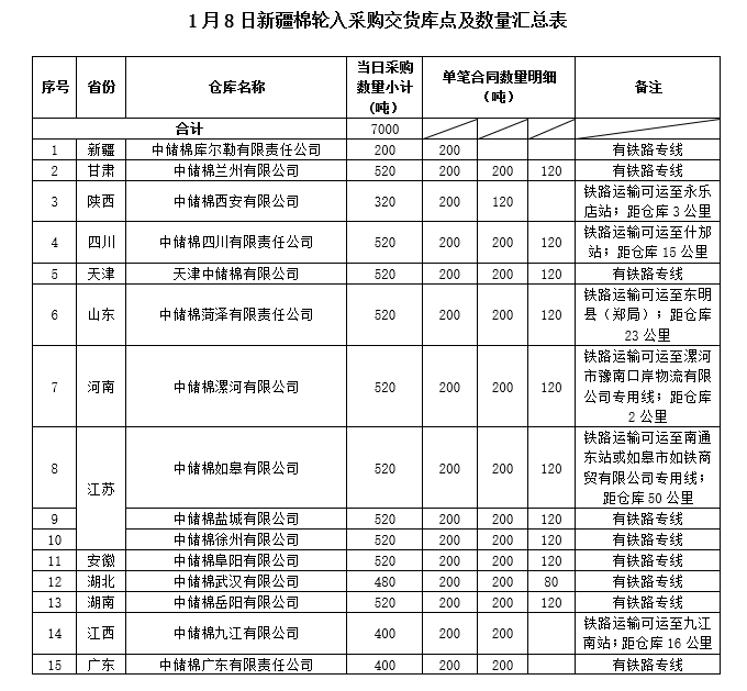 中國(guó)儲(chǔ)備棉管理有限公司定于2020年1月8日采購(gòu)新疆棉7000噸(公定重量),最高限價(jià)13869元/噸(折標(biāo)準(zhǔn)級(jí)3128B價(jià)格)。具體庫(kù)點(diǎn)及數(shù)量如下: