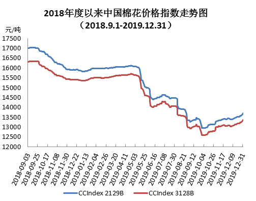 12月,中美經(jīng)貿(mào)磋商進(jìn)展順利,市場相對樂觀。紡企隨用隨買,受收購成本支撐,棉花現(xiàn)貨價格平穩(wěn)上漲。月末,中國棉花價格指數(shù)(CCIndex3128B)13369元/噸,較上月末上漲277元;月均價13154元/噸,環(huán)比上漲94元,同比下跌2253元。