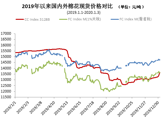 12月,中美第一階段經(jīng)貿(mào)協(xié)議達(dá)成一致,國際棉價上漲。中國進(jìn)口棉價格指數(shù)FCIndexM月均76.95美分/磅,環(huán)比上漲1.32美分。月末79.47美分/磅,高于上月末3.43美分/磅,1%關(guān)稅下折人民幣13724元/噸,高于同期國內(nèi)現(xiàn)貨355元,內(nèi)外棉價差較上月末擴大191元。