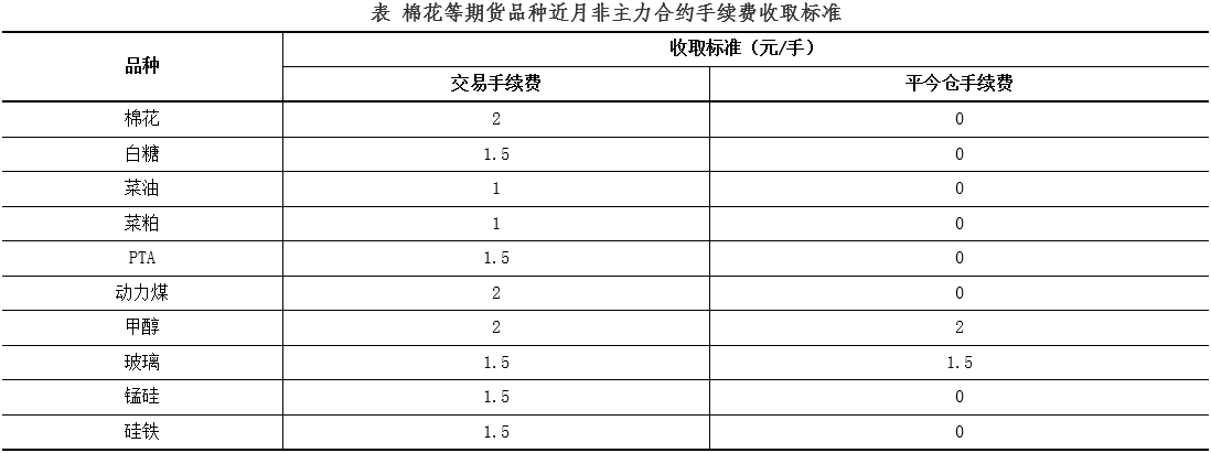 根據(jù)《鄭州商品交易所期貨結(jié)算細(xì)則》第二十七條規(guī)定,經(jīng)研究決定,自2020年1月31日當(dāng)晚夜盤交易時(shí)起,對(duì)棉花等10個(gè)期貨品種交割月份在[N+2,N+5](N為當(dāng)月月份)區(qū)間內(nèi)的非1、5、9合約,手續(xù)費(fèi)標(biāo)準(zhǔn)調(diào)整如下表。