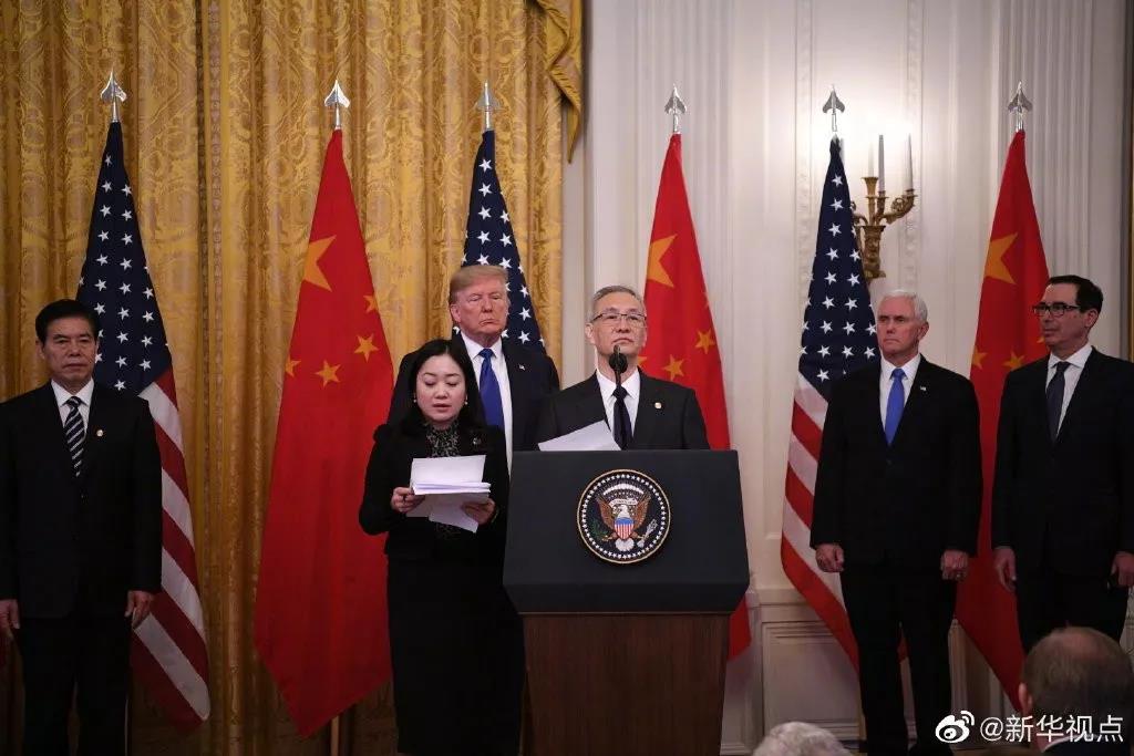當(dāng)?shù)貢r(shí)間1月15日上午,中美第一階段經(jīng)貿(mào)協(xié)議簽署儀式在美國白宮東廳舉行。中共中央政治局委員、國務(wù)院副總理、中美全面經(jīng)濟(jì)對(duì)話中方牽頭人劉鶴與美國總統(tǒng)特朗普共同簽署協(xié)議文本并致辭。