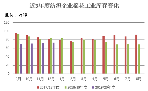 12月,市場行情好轉(zhuǎn),紡紗企業(yè)補庫積極性有所提高,棉花庫存整體上升。截至12月31日紡企棉花庫存量73.25萬噸,較上月底上升0.93萬噸,同比減少13.77萬噸。其中16%企業(yè)減少棉花庫存,43%增加庫存,41%基本保持不變。