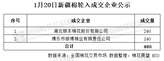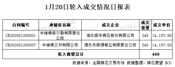 1月20日,中國儲備棉管理有限公司計劃采購新疆棉7000噸,實際成交480噸,成交率6.86%,成交均價14197元/噸。 其中新疆庫成交240噸,內地庫成交240噸。