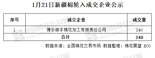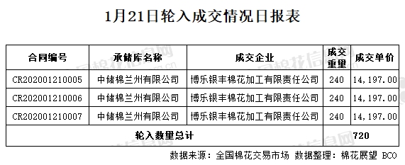 1月21日,中國儲(chǔ)備棉管理有限公司計(jì)劃采購新疆棉7000噸,實(shí)際成交720噸,成交率10.29%,成交均價(jià)14197元/噸。 其中新疆庫成交0噸,內(nèi)地庫成交720噸。