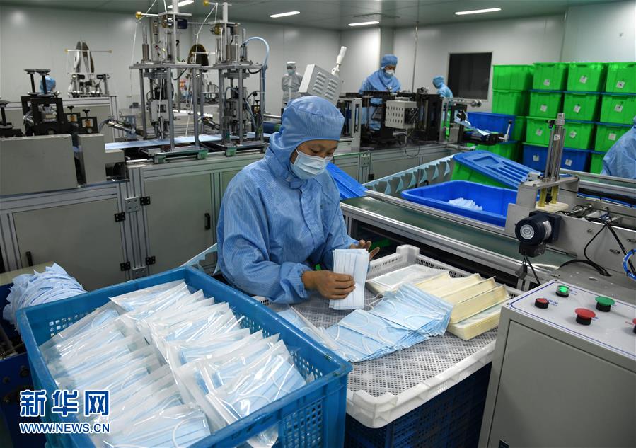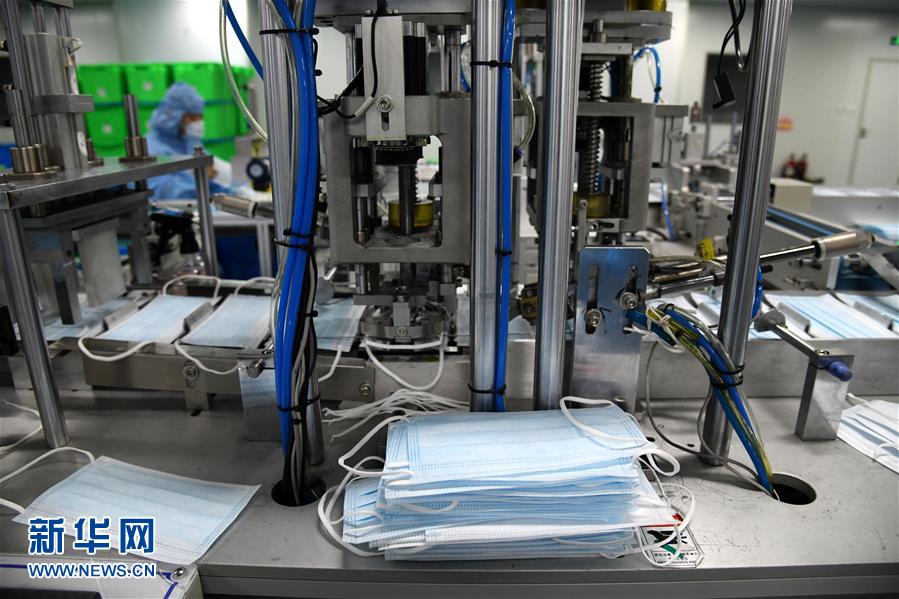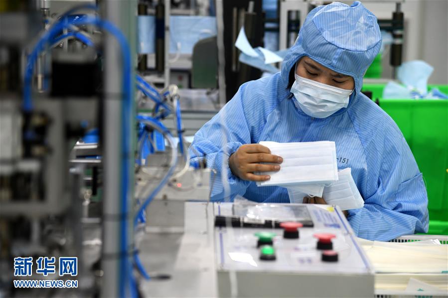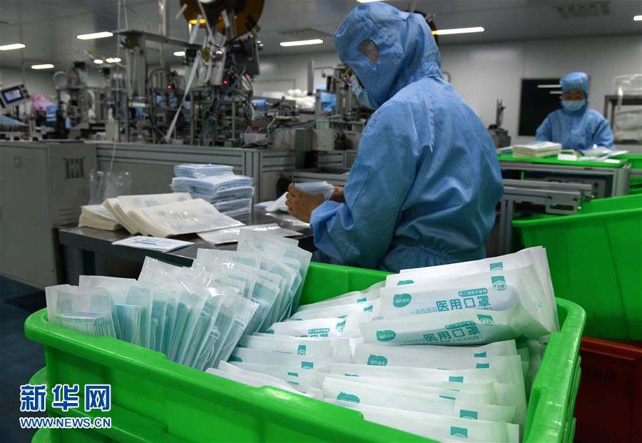 1月28日,在青島海諾生物工程有限公司生產(chǎn)車間,工作人員在嚴(yán)格消毒環(huán)境下生產(chǎn)醫(yī)用口罩。連日來(lái),青島各醫(yī)療防護(hù)用品生產(chǎn)企業(yè)緊急取消春節(jié)休假,全力生產(chǎn)醫(yī)用口罩等防護(hù)用品。