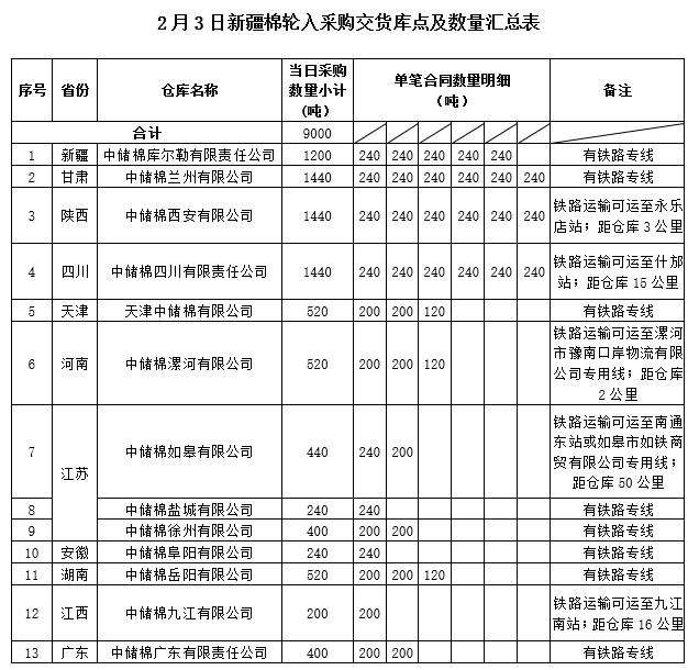 中國儲備棉管理有限公司定于2020年2月3日采購新疆棉9000噸(公定重量),最高限價14135元/噸(折標準級3128B價格)。具體庫點及數(shù)量如下: