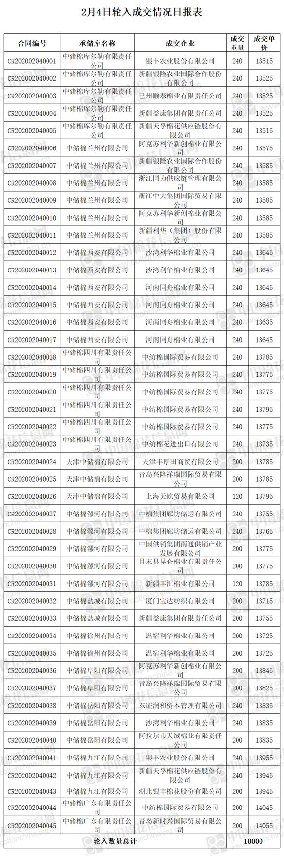 2月4日,中國儲備棉管理有限公司計劃采購新疆棉10000噸,實際成交10000噸,成交率100%,成交均價13723元/噸,最高成交價14055元/噸,最低成交價13515元/噸。 其中新疆庫成交1200噸,內地庫成交8800噸。